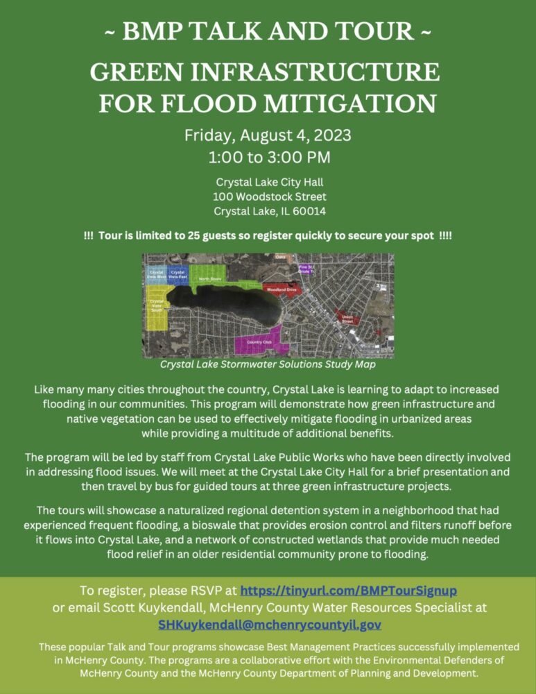 The tours will showcase a naturalized regional detention system in a neighborhood that had experienced frequent flooding, a bioswale that provides erosion control and filters runoff before it flows into Crystal Lake, and a network of constructed wetlands that provide much needed flood relief in an older residential community prone to flooding.
