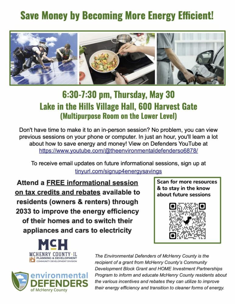 The Environmental Defenders of McHenry County is the recipient of a grant from McHenry County’s Community Development Block Grant and HOME Investment Partnerships Program to inform and educate McHenry County residents about the various incentives and rebates they can utilize to improve their energy efficiency and transition to cleaner forms of energy. To learn more, visit the Defenders resources page at https://tinyurl.com/4energysavings.