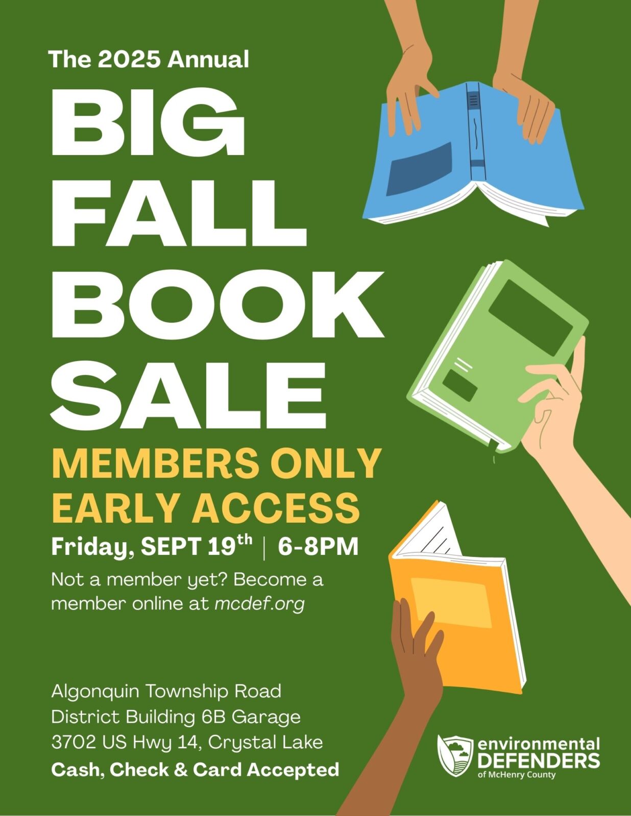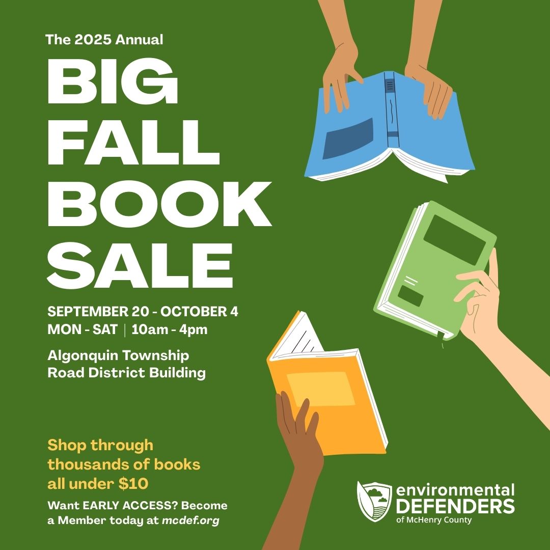 The Environmental Defenders of McHenry County is hosting our Annual Big Fall Book Sale from September 20 - October 4. It will be located at the Algonquin Township Road District Building B Garage. There will be a members-only preview sale Friday, September 20, 6-8pm. If you are not an Environmental Defenders’ member but would like to participate in the pre-sale, you will be able to join online at mcdef.org. The sale begins Saturday, September 20 10am-4pm, and continues running from 10am-4pm through Saturday, October 4. The sale will be closed on Sundays. A $10 Bag Sale will be held Thursday, Friday and Saturday, October 2-4. There will be thousands of like-new books available for purchase with no book over $10. Search through thousands of books and many genres. Stop by and find some paperback treasures!